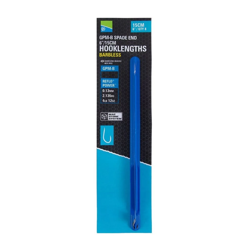Constructed from high-quality materials, Prestonβs GPM-B Spade End Barbless Hooklengths are tied to precise specifications to save you precious time whilst out by the lake. Tied to the unmatched Reflo Power Line, these rigs are suitable for a multitude of baits from maggots and small pellets through to meat, corn and big worm baits!