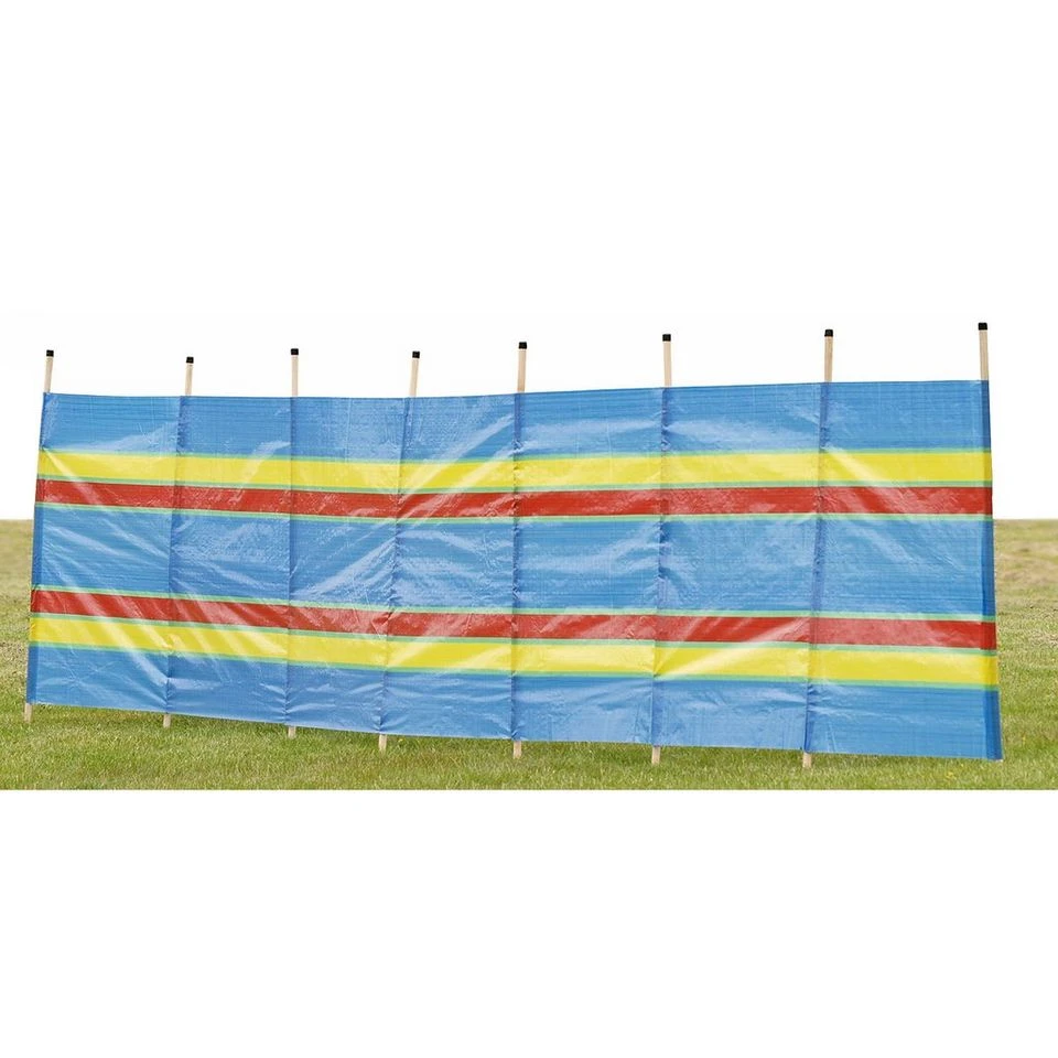 Brightly coloured polythene fabric and wooden poles, the classic windbreak for at the beach on on the campsite.
